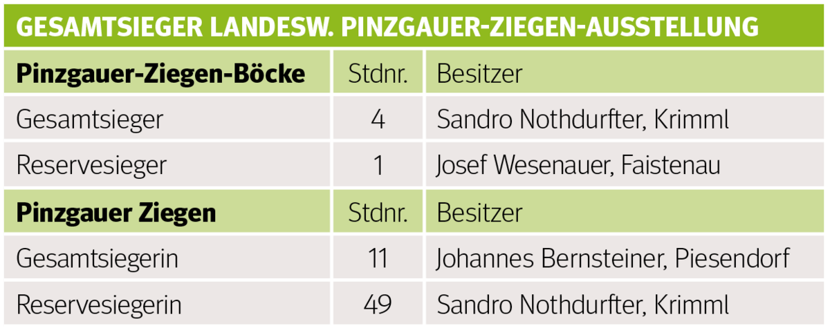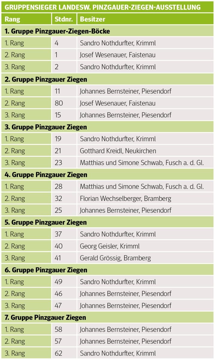 Ganze vier der sieben Gruppensiege konnte der Betrieb Nothdurfter aus Krimml für sich beanspruchen sowie auch den Gesamtsieg bei den Böcken und den Gesamtreservesieg bei den weiblichen Tieren. Die weiteren Gruppensieger stellten die Betriebe Bernsteiner aus Piesendorf und Schwab aus Fusch an der Glocknerstraße. Der Gesamtsieg bei den weiblichen Tieren ging ebenfalls an den Betrieb Bernsteiner. Der Betrieb Wesenauer aus Faistenau stellte den Gesamtreservesieger bei den Böcken.