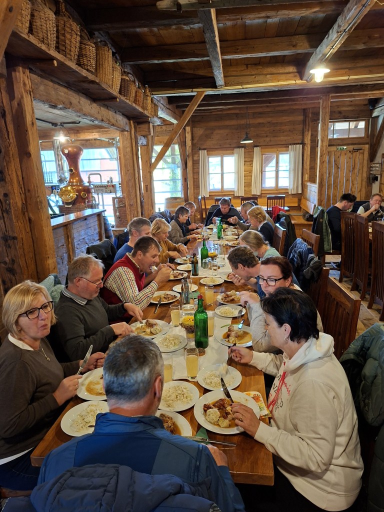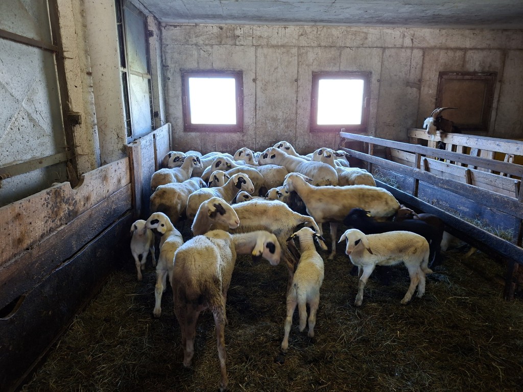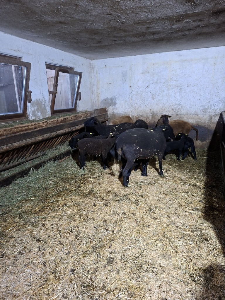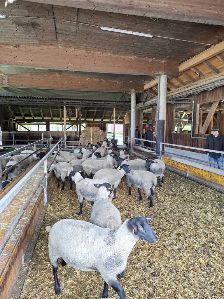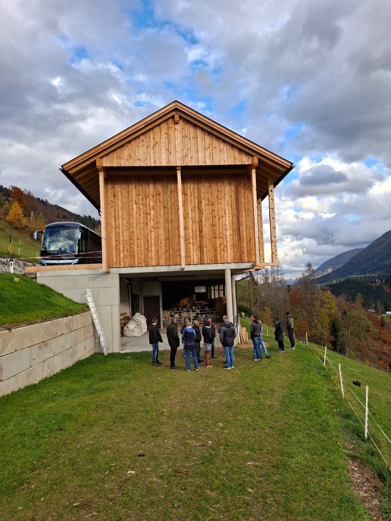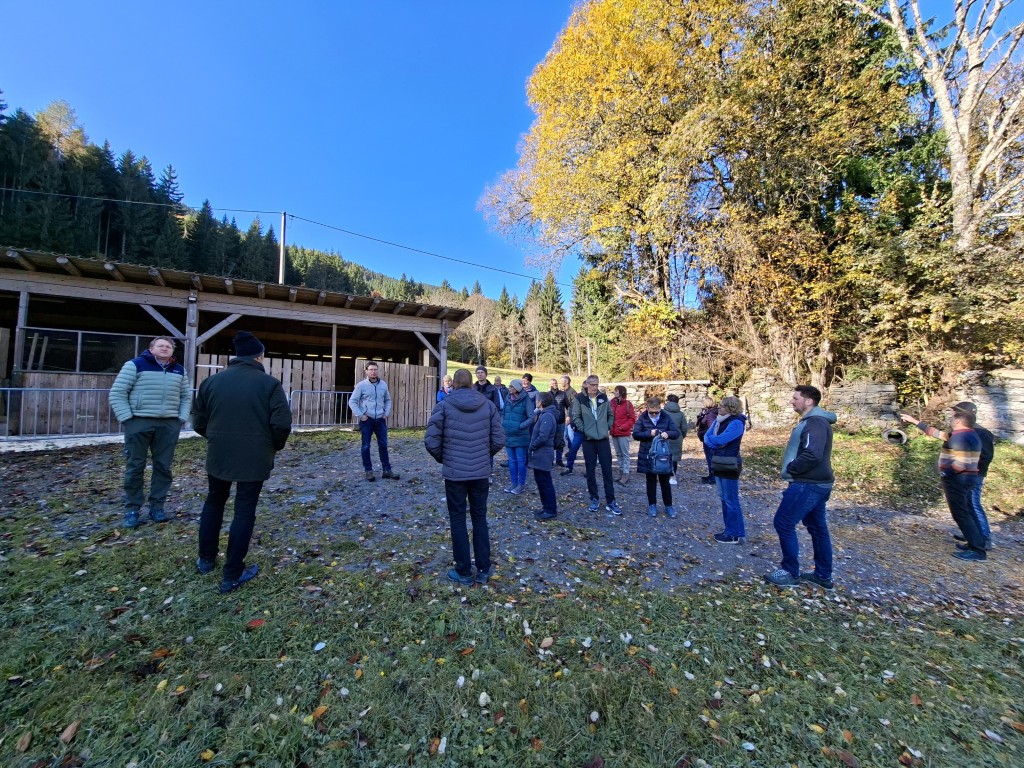 Der erste Halt führte die Gruppe zum Betrieb „Hap und Gut“, wo Krainer Steinschafe und Lacaune gehalten werden. Neben der Schafzucht betreibt die Familie auch Forstwirtschaft. In der hofeigenen Käserei wird die Milch der derzeit 15 Krainer Steinschafe und 15 Lacaune mit einer Milchleistung von 250 bzw. 450 kg verarbeitet. Die Schlachtung der Lämmer erfolgt ebenfalls am Hof. Sowohl die Milch als auch das Fleisch werden regional vermarktet. Die Schafe verbringen die Nächte im Stall als Schutzmaßnahme gegen Wolfsangriffe.
