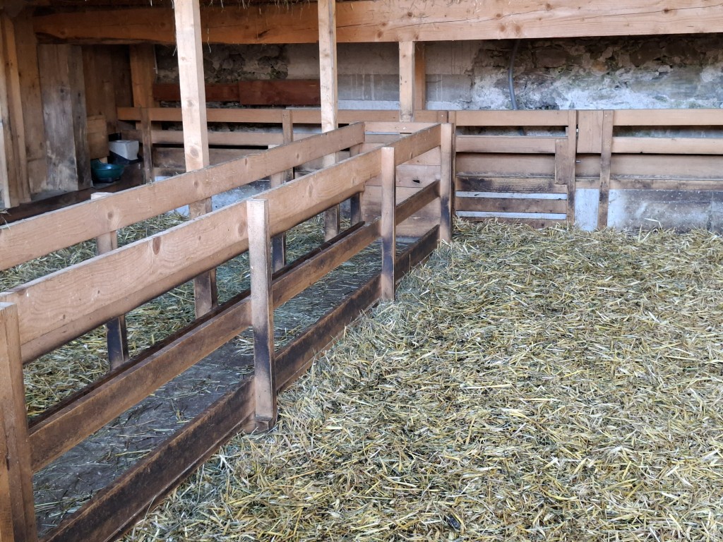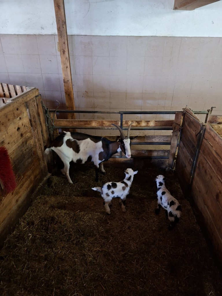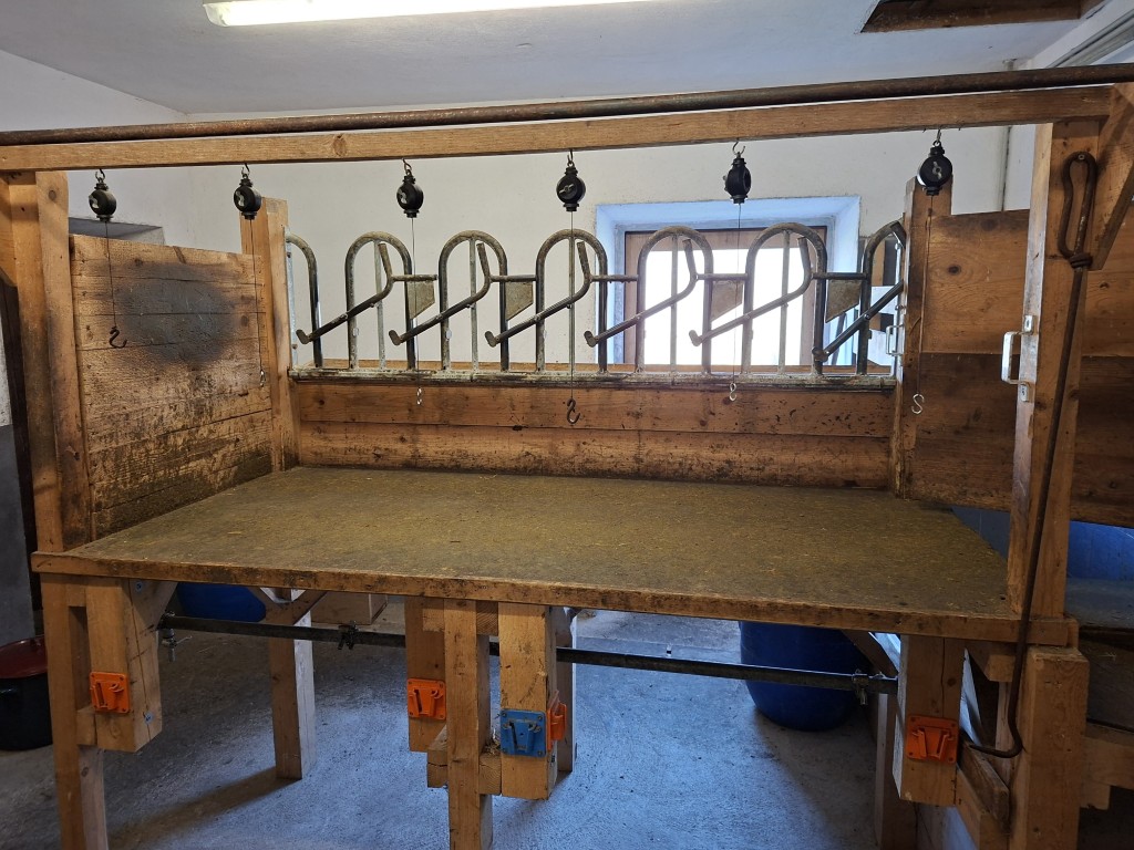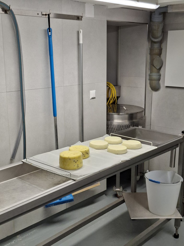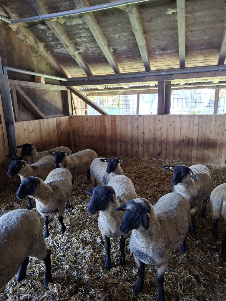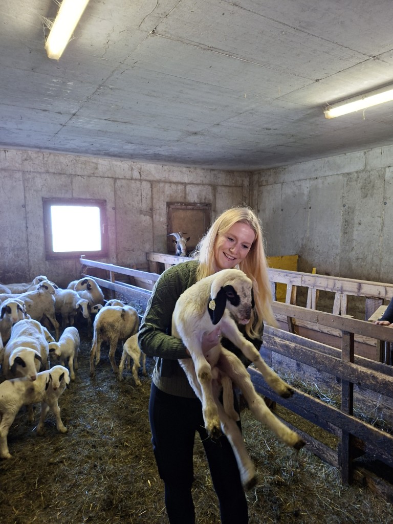 Der erste Halt führte die Gruppe zum Betrieb „Hap und Gut“, wo Krainer Steinschafe und Lacaune gehalten werden. Neben der Schafzucht betreibt die Familie auch Forstwirtschaft. In der hofeigenen Käserei wird die Milch der derzeit 15 Krainer Steinschafe und 15 Lacaune mit einer Milchleistung von 250 bzw. 450 kg verarbeitet. Die Schlachtung der Lämmer erfolgt ebenfalls am Hof. Sowohl die Milch als auch das Fleisch werden regional vermarktet. Die Schafe verbringen die Nächte im Stall als Schutzmaßnahme gegen Wolfsangriffe.