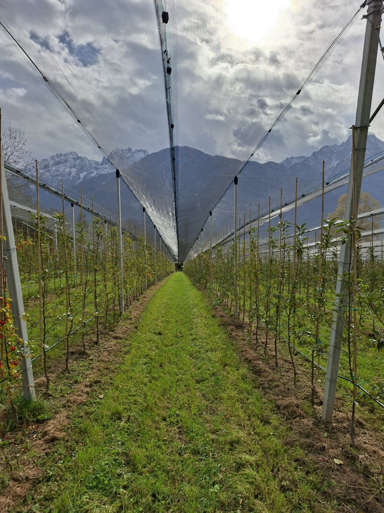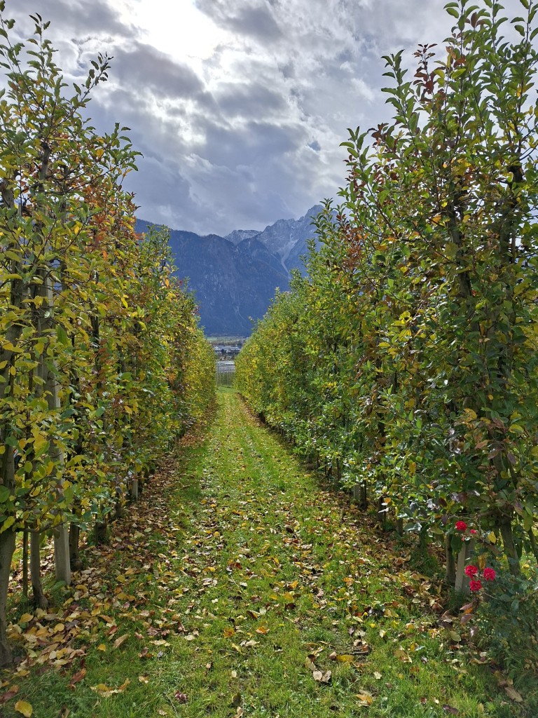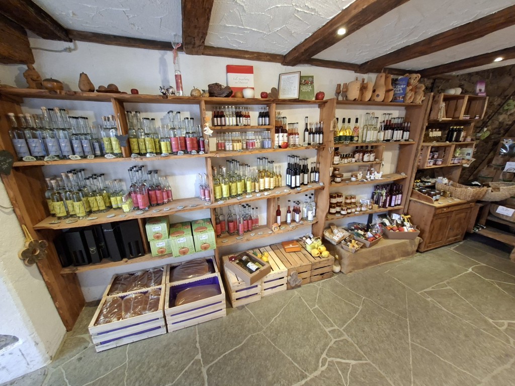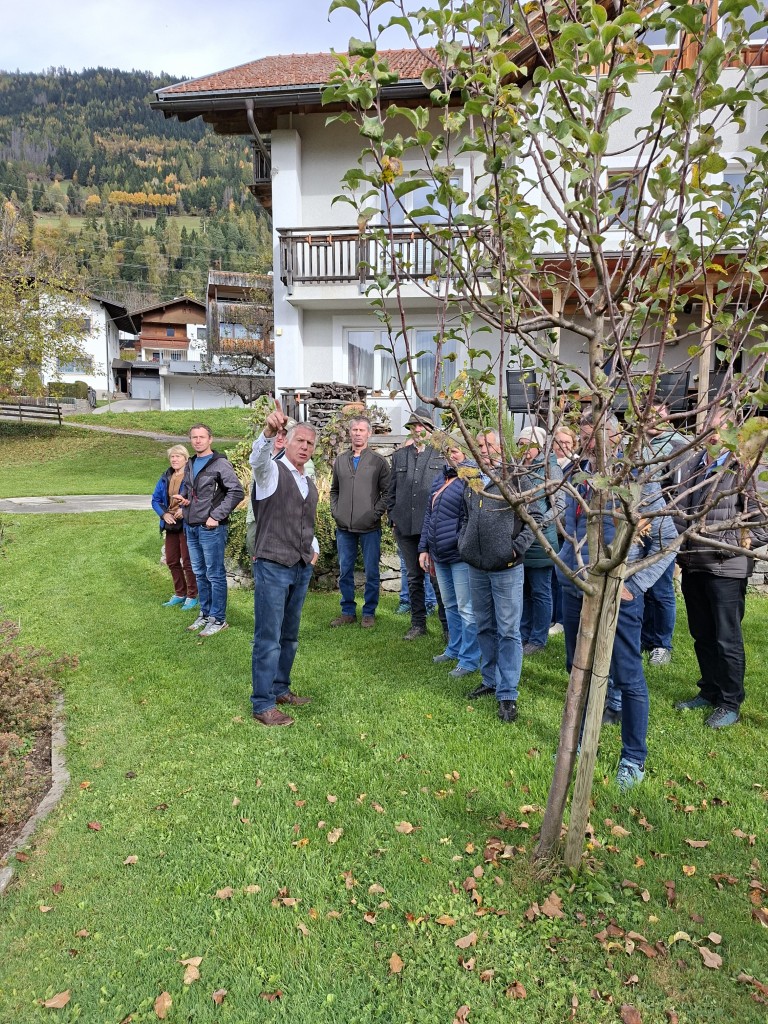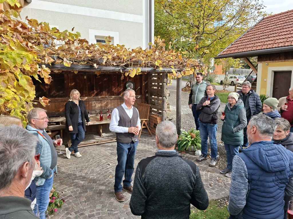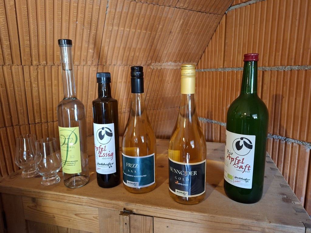 Um auch über den Tellerrand zu blicken, wurde anschließend der Obsthof der Familie Webhofer besichtigt. Dieser ist seit zwei Jahren biozertifiziert und produziert jährlich rund 40.000 Liter Apfelsaft. Daneben werden noch Schnäpse, Cyder und Essig produziert. Die Sorten Gala und Topas werden händisch gepflegt – mit bis zu drei Schnitten pro Baum. Die meiste Arbeit fällt in der Vermarktung an, welche zum Teil über den Hofladen (8 bis 20 Uhr) erfolgt, wo ihnen vor allem der persönliche Kontakt sehr wichtig ist. Dieser soll in Zukunft noch weiter vergrößert und mit Produkten der Region erweitert werden.